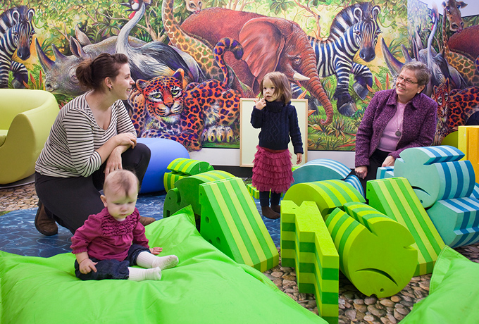 Our vision for the building redesign was to provide the library with a new visual identity, by creating a new street presence that would transform the library into a landmark building on the site. This was established by introducing two storey glazed walls along the full extent of the north and west building facades. This provides the community with unobstructed views into the library and to the street from the interior. Natural light penetrates deep into the building and creates a public friendly interior space. Colourful glass panels animate the building exterior and a large "LIBRARY" sign displayed on the west wall informs the community that this is a public building for their use.