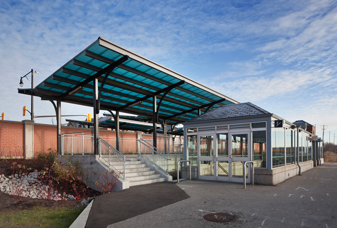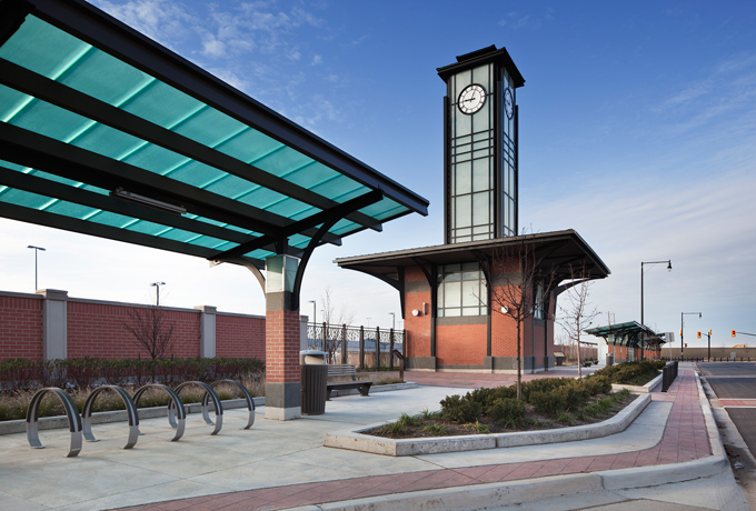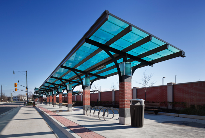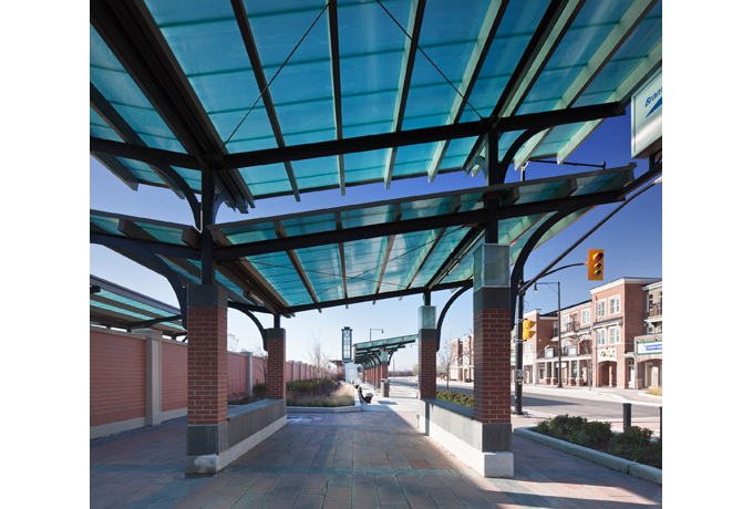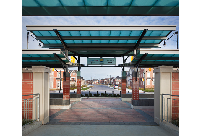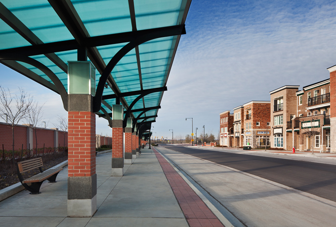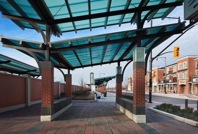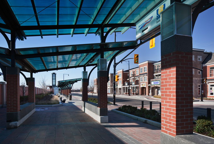 Included as part of the new Mount Pleasant Village neighbourhood in Brampton, are 2 GO pavilions, 3 Brampton transit bus stations and 5 transit shelters. Also included is a new glass enclosed clock tower that is a landmark building on the site and serves as a beacon at night.